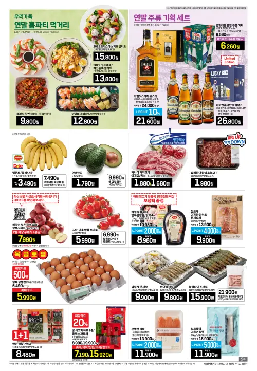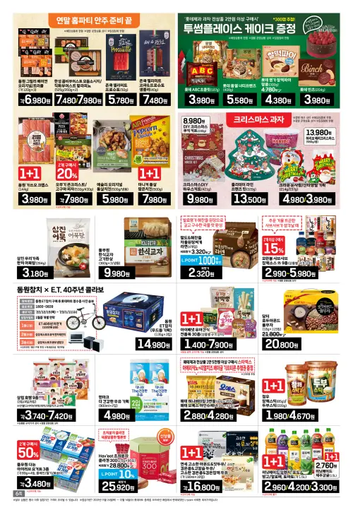 과일, 정육, 제주도 과일 및 채소, 수산물, 쌀, 잡곡, 홈파티 먹거리, 연말 주류 기획세트, 계란, 밀 키트, 가공식품, 생필품 등 매우 다양한 제품들이 할인 행사를 진행하고 있으니, 전단지를 꼼꼼히 살펴보신 후 구매에 참고하시기 바랍니다.