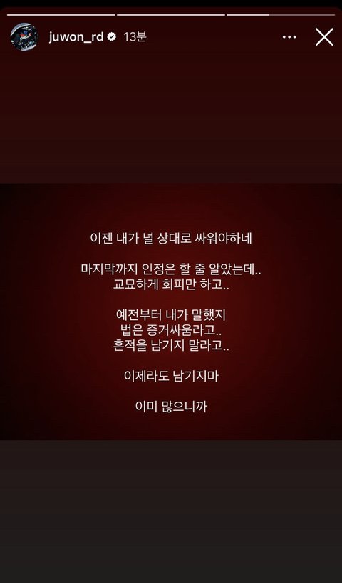 "이젠 내가 널 상대로 싸워야 하네 마지막까지 인정은 할 줄 알았는데.. 교묘하게 회피만 하고.. 예전부터 내가 말했지 법은 증거싸움이라고.. 흔적을 남기지 말라고.. 이제라도 남기지 마 이미 많으니까"