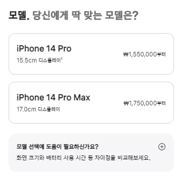 미국 원화로는 출시 가격이 동결되었지만 치솟는 환율로 인해 전작 아이폰 13 시리즈에 비해 가격이 조금 비싸졌습니다. 가장 값비싼 제품이 250만 원이나 하니 휴대폰 한 대 값이 웬만한 컴퓨터 가격과 비슷하여 금액적으로 살짝 부담이 됩니다.