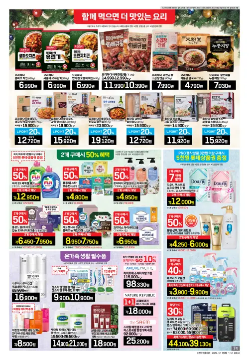 과일, 정육, 제주도 과일 및 채소, 수산물, 쌀, 잡곡, 홈파티 먹거리, 연말 주류 기획세트, 계란, 밀 키트, 가공식품, 생필품 등 매우 다양한 제품들이 할인 행사를 진행하고 있으니, 전단지를 꼼꼼히 살펴보신 후 구매에 참고하시기 바랍니다.